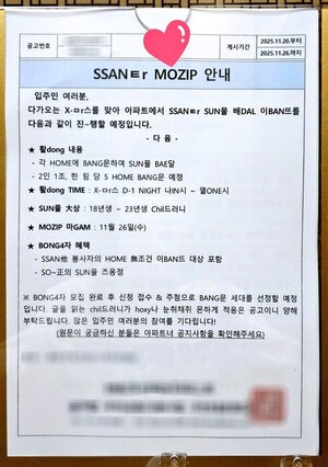 크리스마스를 앞두고 한 아파트에 붙은 ‘산타 모집 안내문’이 기발한 암호문 형태로 작성돼 온라인에서 화제를 모으고 있다.최근 엑스(X·옛 트위터)에는 "저희 집 아파트 공지문 한번 보실래요? 지금 어른들이 제일 신난 게 포인트"라는 글과 함께 아파트 현관에 부착된 안내문 사진이 올라왔다. 공지는 한글과 영어, 숫자, 한자를 뒤섞은 형태로 작성됐는데, 아이들이 내용을 눈치채지 못하도록 일부러 '해독이 필요하도록' 만들어졌다.안내문의 제목은 'SSANㅌr MOZIP 안내'. '산타 모집 안내'라는 뜻이다. 실제 공고문은 '활동 내용:
