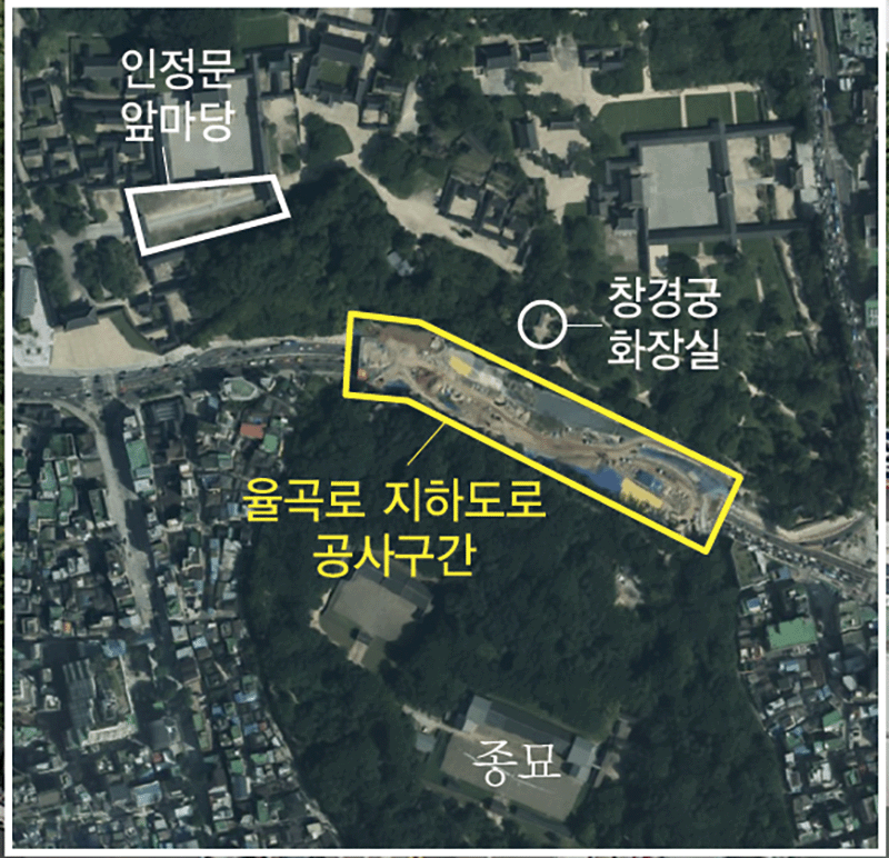 1931년 일제는 창덕궁·창경궁과 종묘 사이의 언덕과 담장을 헐고 도로를 만들었는데 이것이 ‘율곡로’이다. 궁궐과 종묘를 단절하려는 의도로 읽힌다. 실제 풍수 전문가들은 율곡로에 대해 “용맥의 혈이 지나는 지점을 도로가 가로질러 가고 있다”고 평가한다. 이 문제를 해결하기 위해 도로 위에 지붕을 올려 궁궐과 종묘를 연결한 것이 ‘율곡로 지하화 사업’이다. 하지만 전용원 회장은 “일제가 만든 율곡로는 땅 위를 포장한 것에 불과해 풍수적으로 큰 의미가 없지만 우리는 아예 깊이 파헤쳐서 용맥을 잘라 버렸다”고 주장한다.