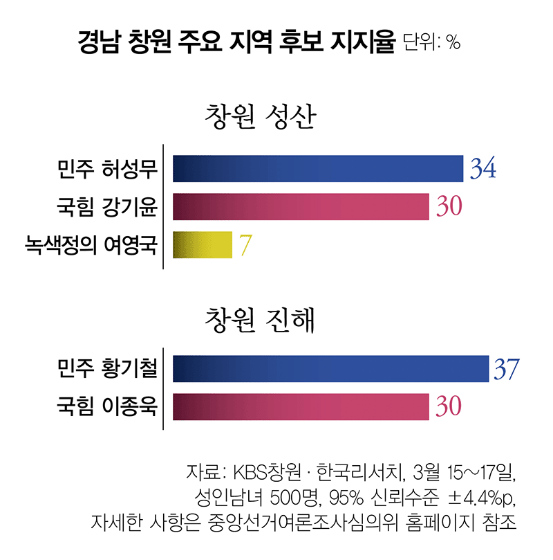 그 결과 후보단일화 직후인 지난 3월 15일부터 17일까지 KBS창원방송총국이 한국리서치와 함께 실시한 조사에 따르면, 민주당 허성무 후보는 34%의 지지를 얻어 3선에 도전하는 국민의힘 강기윤 후보(30%)를 오차범위 내에서 근소하게 앞서는 것으로 조사됐다.(무선 전화면접 방식, 자세한 사항은 중앙선거여론조사심의위 참조)