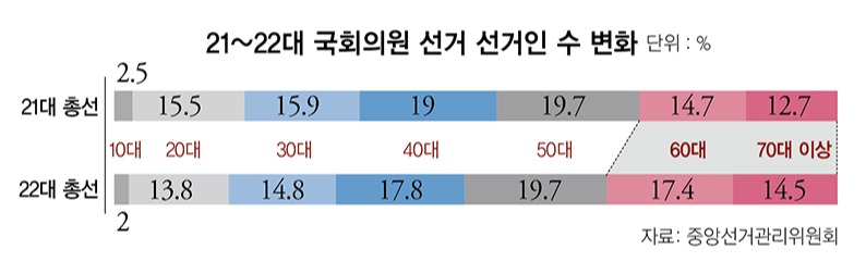 한국은 세계에서 가장 빠르게 늙어가는 국가다. 이 때문에 노년층 유권자는 그 어느 때보다 두껍다. 이번 22대 총선 기준 60세 이상 유권자(선거인) 수는 4년 전인 21대 총선 때보다 210만559명이 늘었다. 비중으로 보면 21대 총선과 비교해 60세 이상 비중이 4.5%포인트 많아졌다. 20대(13.82%)와 30대(14.82%)를 합한 것보다 3.25%포인트 높다.