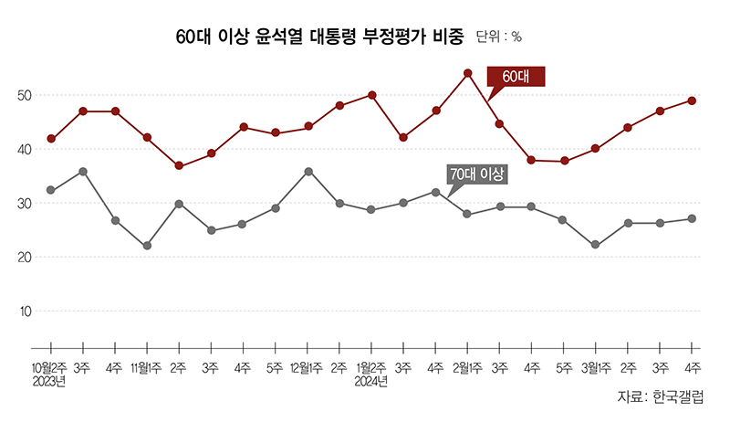 60대의 이탈은 최근 6개월간 부정평가를 추적해 봐도 드러난다. 한국갤럽 조사에서 지난해 10월 2주 차 42%로 출발한 윤 대통령에 대한 60대의 부정평가는 2024년 새해 첫 조사에서 50%까지 올랐고 최근 또다시 이에 근접한 수치를 기록하고 있다. 이 기간 조사된 부정평가에서 60대는 70대 이상과 대략 15%포인트 내외의 차이를 보이며 높은 수치를 유지해왔다.