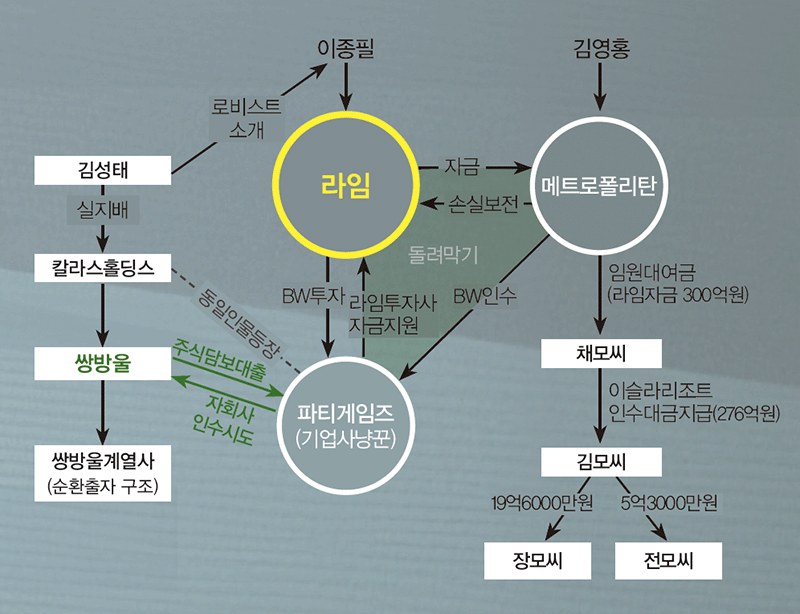 칼라스홀딩스에서 감사를 역임한 이모씨는 라임이 신주인수권부사채(BW) 매입을 통해 400억원을 투입한 코스닥 상장사 파티게임즈를 무자본 인수해 회사 자금을 빼돌린 기업사냥꾼 중 한 명이다. 또 칼라스홀딩스 사내이사와 감사를 지낸 김모씨는 파티게임즈 기업사냥꾼들에게 명의를 빌려 줘 기업사냥꾼들 소유의 페이퍼컴퍼니에 대표이사로 이름을 올렸다. 김영홍 회장의 메트로폴리탄은 파티게임즈가 2018년 회계법인으로부터 감사의견 거절을 받아 상장폐지 이슈가 발생한 지 일주일 만에 계열사를 통해 파티게임즈 BW를 액면가격(권면총액)대로 사들였다. 라임과 기업사냥꾼, 메트로폴리탄이 합을 맞춘 이른바 ‘돌려막기 투자’다.
