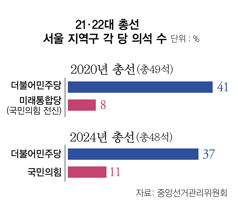 국민의힘이 4년 전 총선에 이어 서울에서 또다시 무너졌다. 지난 4월 10일 제22대 총선에서 집권 여당인 국민의힘은 총 48개 의석이 걸린 서울에서 11석을 얻는 데 그쳤다. 4년 전인 지난 2020년 21대 총선 때 국민의힘의 전신인 미래통합당이 서울에서 8석을 얻은 것보다는 다소 나아진 결과라고는 하지만, 총 60석이 걸린 경기도와 함께 최대 승부처로 꼽히는 서울에서 밀리면서 전체 선거에서 또다시 참패했다.