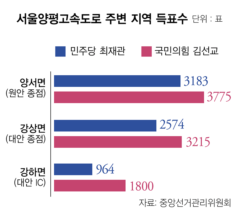 이는 서울양평고속도로 원안과 대안노선의 시종점과 고속도로 진출입로(IC) 예정지 인근의 세부 선거결과를 통해서도 입증된다. 국민의힘 김선교 당선인은 당초 원안에서 서울양평고속도로 시종점이 들어설 예정이었던 남한강 이북 양서면은 물론, 대안노선의 시종점인 남한강 이남 강상면에서도 모두 최재관 후보를 눌렀다.