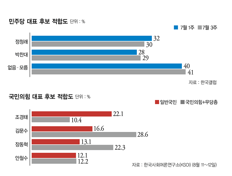 한국갤럽의 민주당 대표 후보 지지도 조사에서 7월 1주 차엔 ‘지지 후보가 없다’ 또는 ‘모르겠다’가 전체의 절반에 육박하는 40%였다. 3주 뒤에 다시 조사해 보니 유보 의견이 41%로 더 늘었다. 친(親)민주당 성향 김어준씨의 ‘여론조사꽃’ 조사도 전당대회에 대한 무관심이 확인됐다. 7월 21일 발표한 당대표 후보 적합도 조사에서 ‘모름·무응답’이 41%였고, 일주일 후 전당대회 직전에는 44%에 달했다.