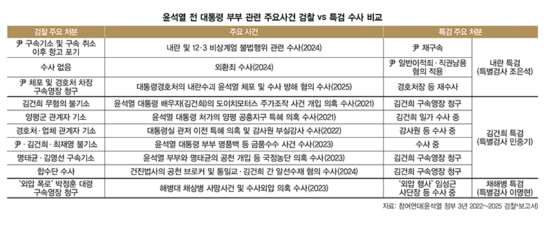 법조계 안팎에서는 특검 수사가 여론의 지지를 받는 이유가 검찰이 윤 전 대통령과 배우자 김 여사를 둘러싼 각종 의혹에 대해 과도한 면죄부를 줬기 때문이란 지적이 나온다. 한상희 건국대 법학전문대학원 명예교수(참여연대 공동대표)는 “검찰이 권력의 중심축이 돼 대통령의 방패이자 정치 플레이어로 뛰어들어 반민주적 상황을 만들었다”고 비판했다. 검찰이 윤 전 대통령과 측근 관련 의혹에는 눈감고, 반대 세력에 대해서는 대규모 수사를 집중해 ‘되치기 수사’와 ‘사건 암장’으로 수사통치를 펼쳤다는 것이다. 오병두 홍익대 법학과 교수는 지난 윤석열 정부 3년간 검찰 수사를 ‘검찰권 남용과 정치적 수사’로 정리하며, 과잉 혹은 과소 수사가 정치적 편향에 따라 기획되고 수행됐다고 평가했다.