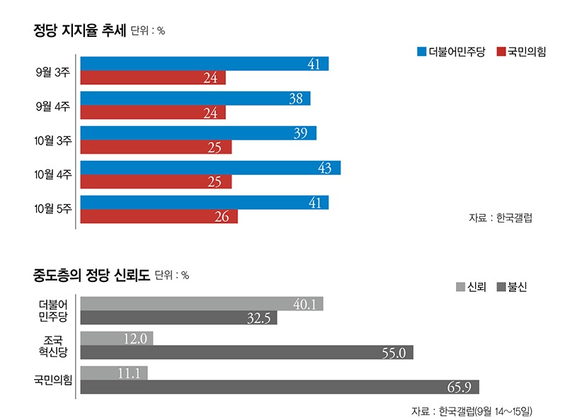 하지만 최근에는 여권발(發) 악재가 쏟아져도 야당 쪽으로 반사이익의 훈풍이 불지 않고 있다. ‘정치의 상식’이 작동하지 않는 이례적 상황이다. 국민의힘은 지지율이 6월 대선 이후 다섯 달째 20%대 초중반에 머물고 있다. 10월 5주차 조사에서도 한국갤럽은 26%, NBS는 25%로 민주당보다 14~15%포인트 뒤처졌다.